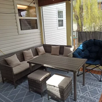 This set is not just a furniture piece; it’s a lifestyle choice. It’s perfect for enjoying summer barbeques, evening drinks, or simply relaxing under the sun. The elegant gray rattan and beige cushions effortlessly complement any outdoor decor, bringing a touch of sophistication to your space. The set’s modularity allows for various arrangements, catering to different occasions and preferences.