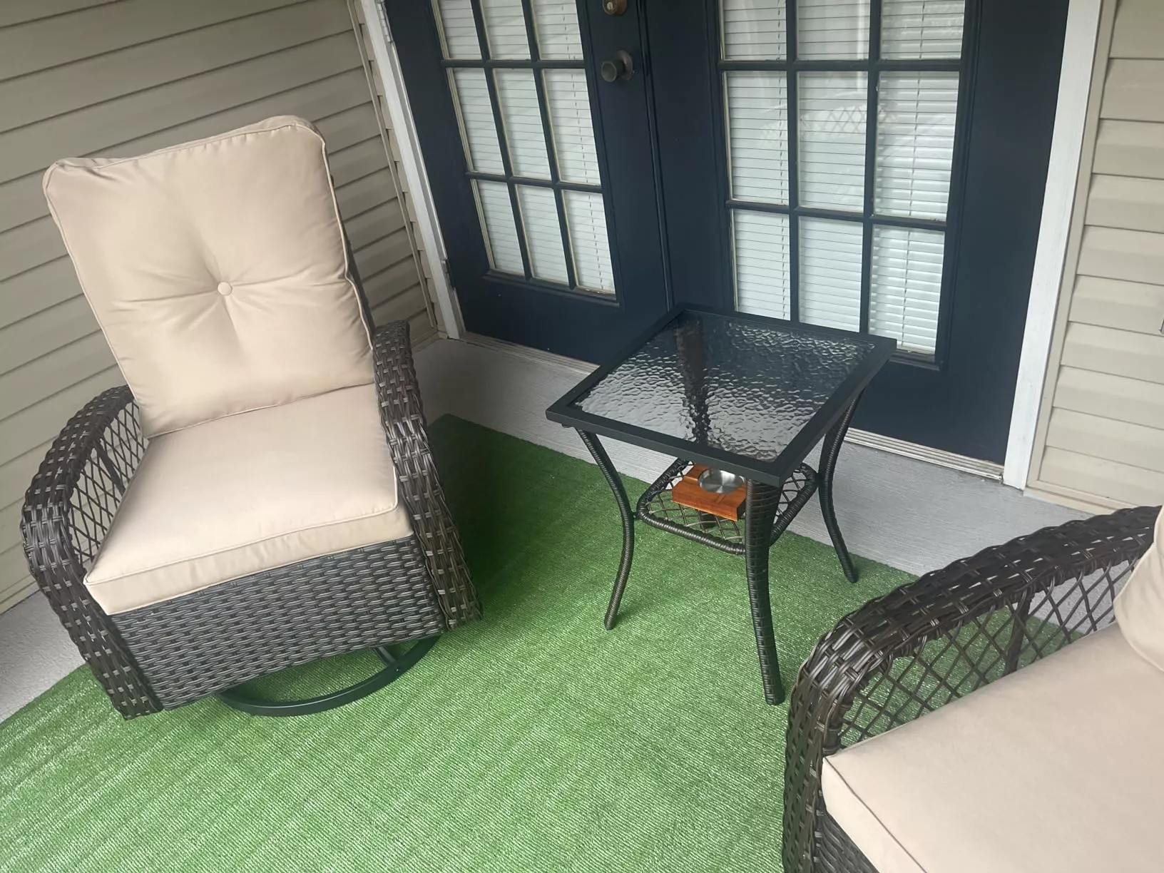 This furniture set stands out due to its unique combination of style, comfort, and durability. The 360° swivel rocking chairs allow for easy movement and interaction, making it convenient to reach for items or chat with friends without getting up. The stylish side table with its tempered glass top not only provides a practical surface but also adds a touch of sophistication to your outdoor space.