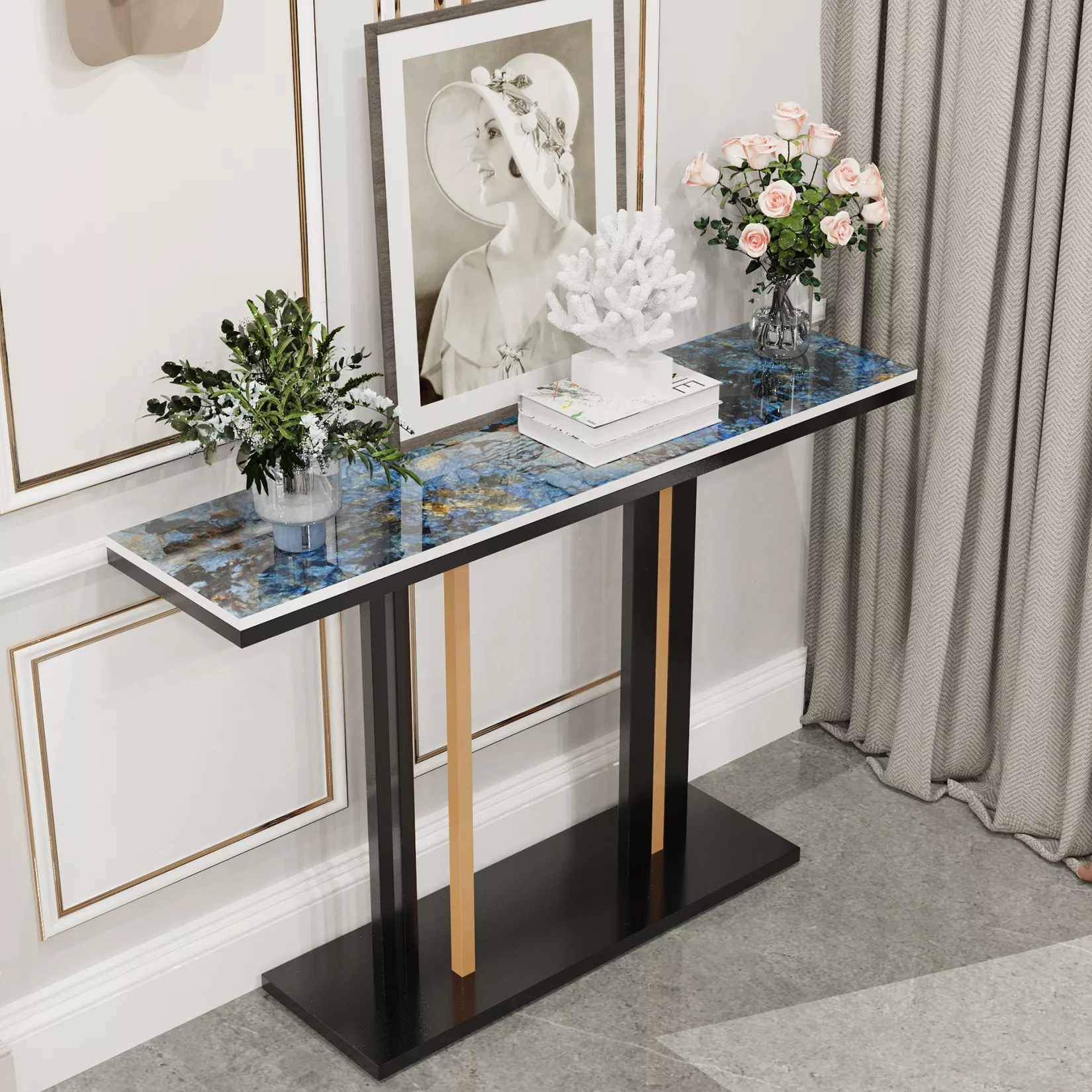 Transform your hallway, entryway, or living room with the Contemporary Console Table with Stone Top and Pedestal Base. This beautifully designed table combines Nordic simplicity with modern luxury, offering both functionality and aesthetic appeal. Its unique textures and sleek design make it a standout piece that effortlessly enhances your home decor.