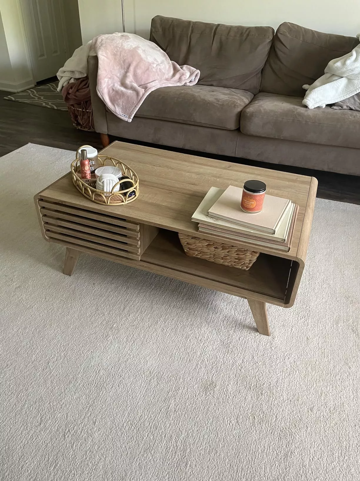 • Dual Storage System: Equipped with a wood slat sliding door, this table provides ample storage with four separate compartments. The dual-sided design allows for easy access from any angle, enhancing the functionality of your living space.